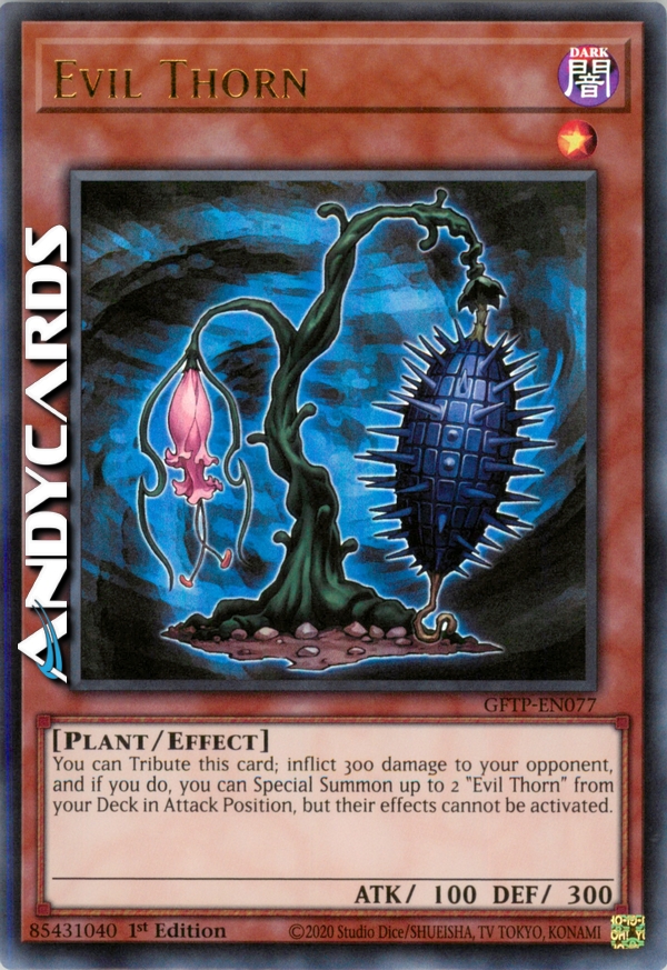 You can Tribute this card; inflict 300 damage to your opponent, and if you do, you can Special Summon up to 2 "Evil Thorn" from your Deck in Attack Position, but their effects cannot be activated.