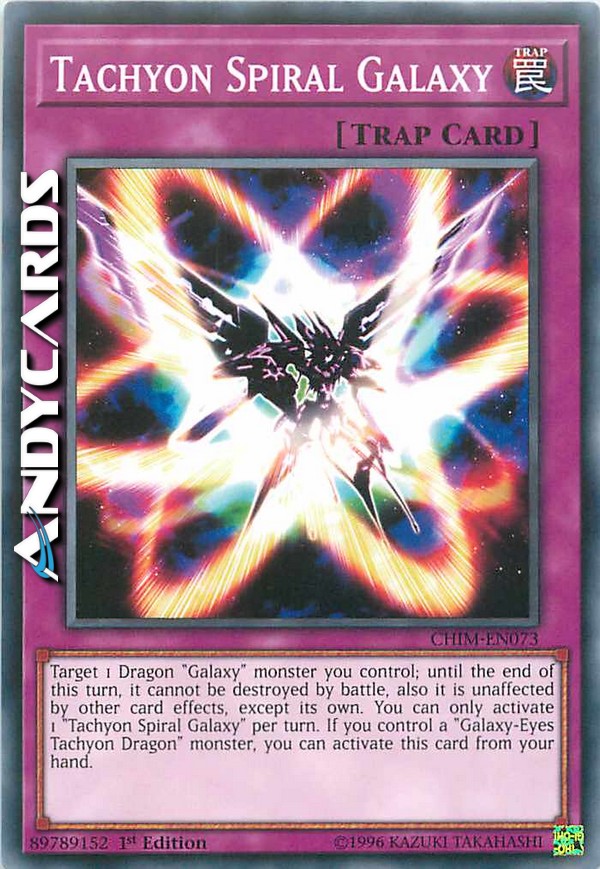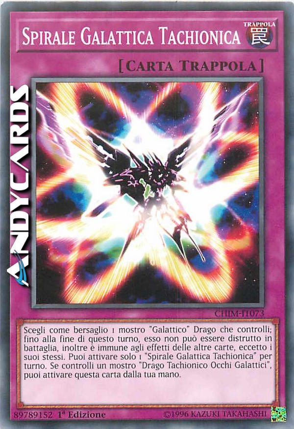 Scegli come bersaglio 1 mostro "Galattico" Drago che controlli; fino alla fine di questo turno, esso non può essere distrutto in battaglia, inoltre è immune agli effetti delle altre carte, eccetto i suoi stessi. Puoi attivare solo 1 "Spirale Galattica Tachionica" per turno. Se controlli un mostro "Drago Tachionico Occhi Galattici", puoi attivare questa carta dalla tua mano.