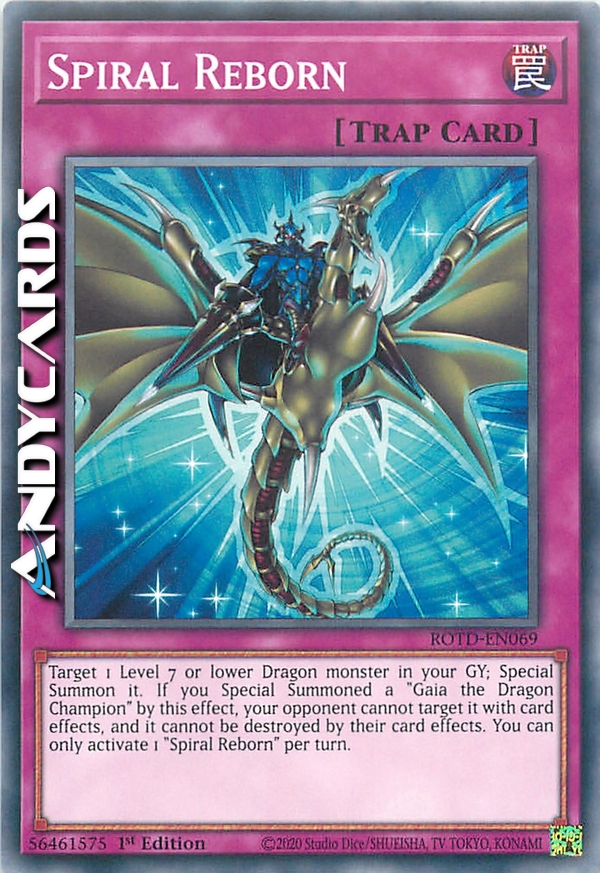 Target 1 Level 7 or lower Dragon monster in your GY; Special Summon it. If you Special Summoned a "Gaia the Dragon Champion" by this effect, your opponent cannot target it with card effects, and it cannot be destroyed by their card effects. You can only activate 1 "Spiral Reborn" per turn.