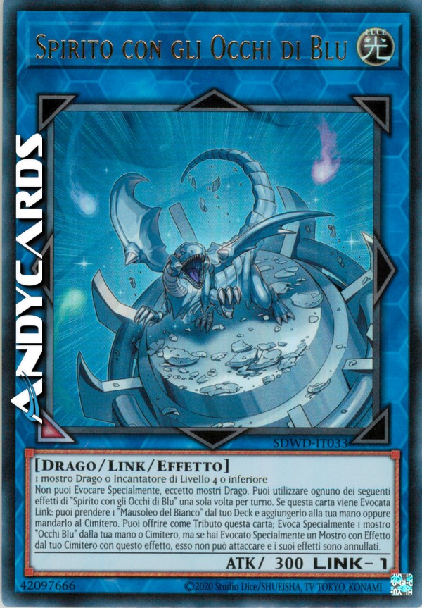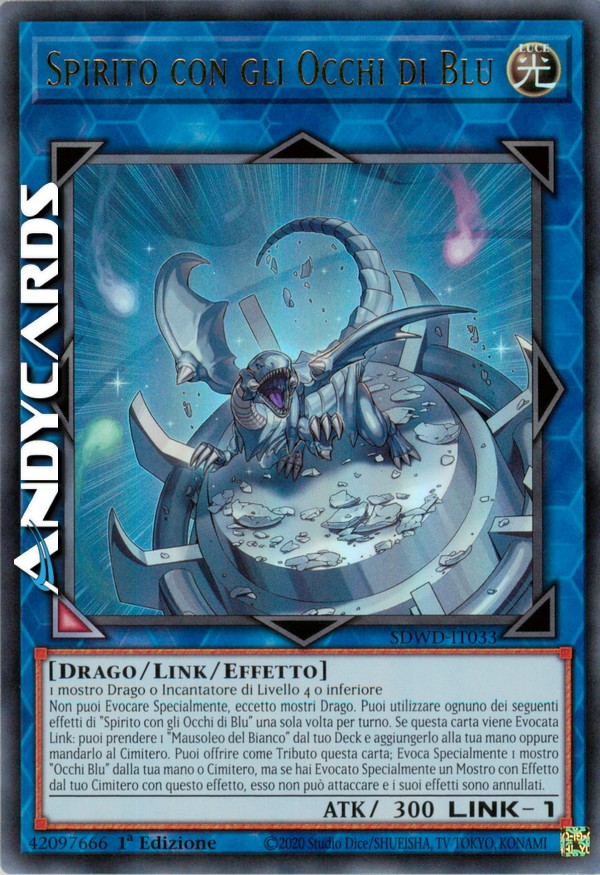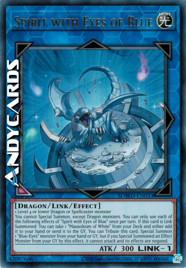 Non puoi Evocare Specialmente, eccetto mostri Drago. Puoi utilizzare ognuno dei seguenti effetti di "Spirito con gli Occhi di Blu" una sola volta per turno. Se questa carta viene Evocata Link: puoi prendere 1 "Mausoleo del Bianco" dal tuo Deck e aggiungerlo alla tua mano oppure mandarlo al Cimitero. Puoi offrire come Tributo questa carta; Evoca Specialmente 1 mostro "Occhi Blu" dalla tua mano o Cimitero, ma se hai Evocato Specialmente un Mostro con Effetto dal tuo Cimitero con questo effetto, esso non può attaccare e i suoi effetti sono annullati.