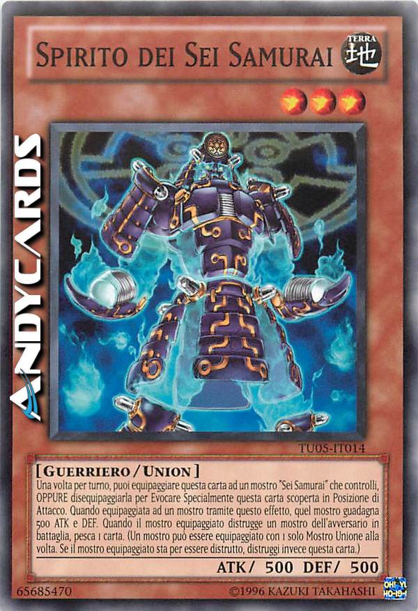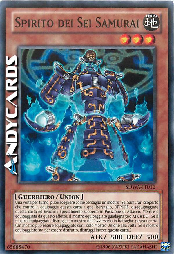 Una volta per turno, puoi equipaggiare questa carta ad un mostro "Sei Samurai" che controlli, OPPURE disequipaggiarla per Evocare tramite Evocazione Speciale questa carta scoperta in Posizione di Attacco. Quando equipaggiata ad un mostro tramite questo effetto, quel mostro guadagna 500 ATK e DEF. Quando il mostro equipaggiato distrugge un mostro dell'avversario in battaglia, pesca 1 carta. (Un mostro può essere equipaggiato con 1 solo Mostro Unione alla volta. Se il mostro equipaggiato sta per essere distrutto distruggi invece questa carta.)