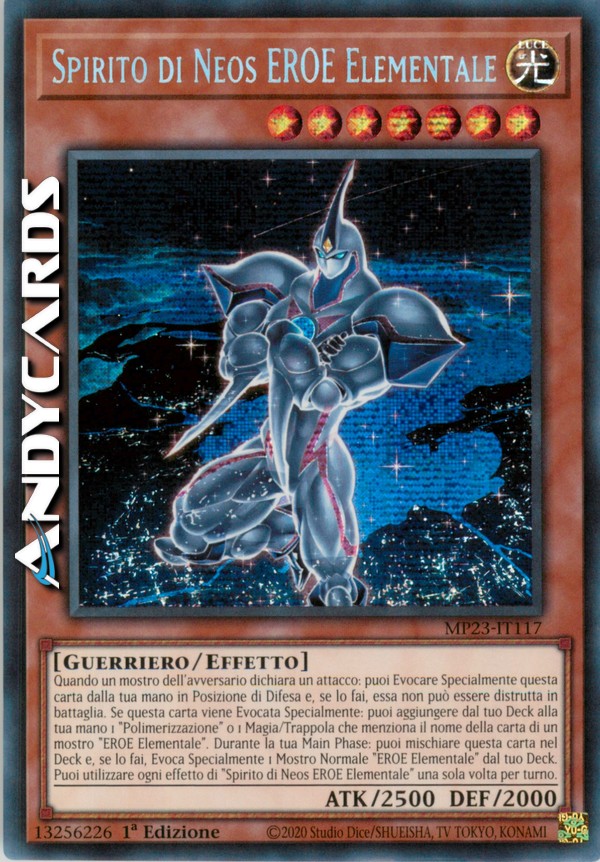 Quando un mostro dell'avversario dichiara un attacco: puoi Evocare Specialmente questa carta dalla tua mano in Posizione di Difesa e, se lo fai, essa non può essere distrutta in battaglia. Se questa carta viene Evocata Specialmente: puoi aggiungere dal tuo Deck alla tua mano 1 "Polimerizzazione" o 1 Magia/Trappola che menziona il nome della carta di un mostro "EROE Elementale". Durante la tua Main Phase: puoi mischiare questa carta nel Deck e, se lo fai, Evoca Specialmente 1 Mostro Normale "EROE Elementale" dal tuo Deck. Puoi utilizzare ogni effetto di "Spirito di Neos EROE Elementale" una sola volta per turno.