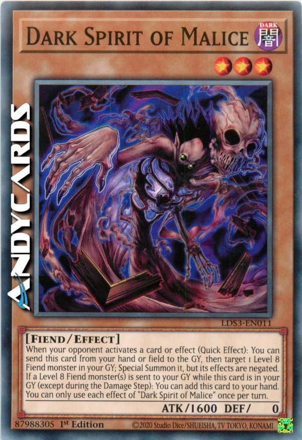 When your opponent activates a card or effect (Quick Effect): You can send this card from your hand or field to the GY, then target 1 Level 8 Fiend monster in your GY; Special Summon it, but its effects are negated. If a Level 8 Fiend monster(s) is sent to your GY while this card is in your GY (except during the Damage Step): You can add this card to your hand. You can only use each effect of "Dark Spirit of Malice" once per turn.