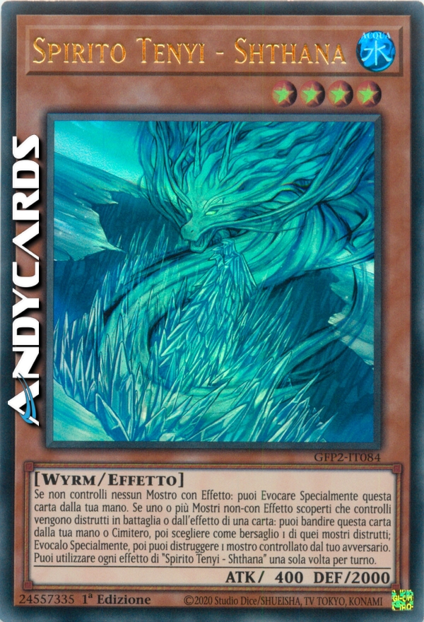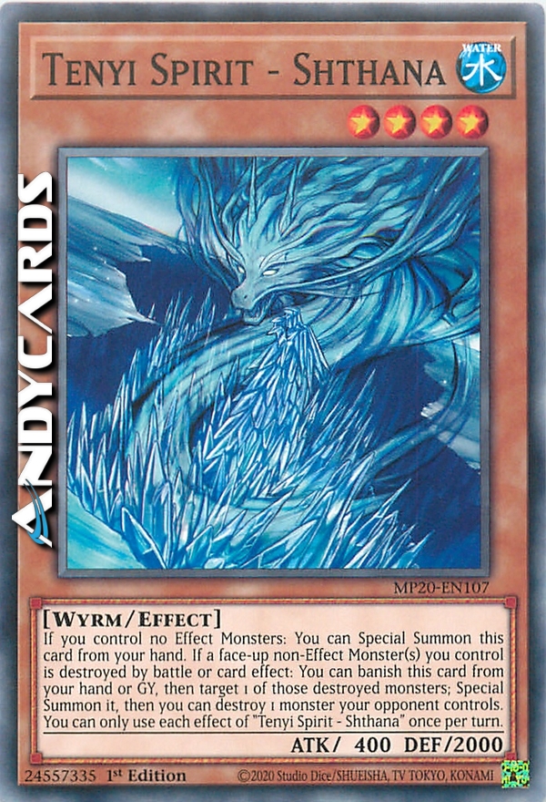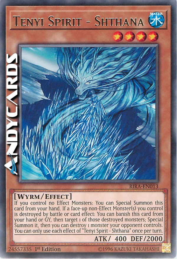 Se non controlli nessun Mostro con Effetto: puoi Evocare Specialmente questa carta dalla tua mano. Se uno o più Mostri non-con Effetto scoperti che controlli vengono distrutti in battaglia o dall'effetto di una carta: puoi bandire questa carta dalla tua mano o Cimitero, poi scegliere come bersaglio 1 di quei mostri distrutti; Evocalo Specialmente, poi puoi distruggere 1 mostro controllato dal tuo avversario. Puoi utilizzare ogni effetto di "Spirito Tenyi - Shthana" una sola volta per turno.