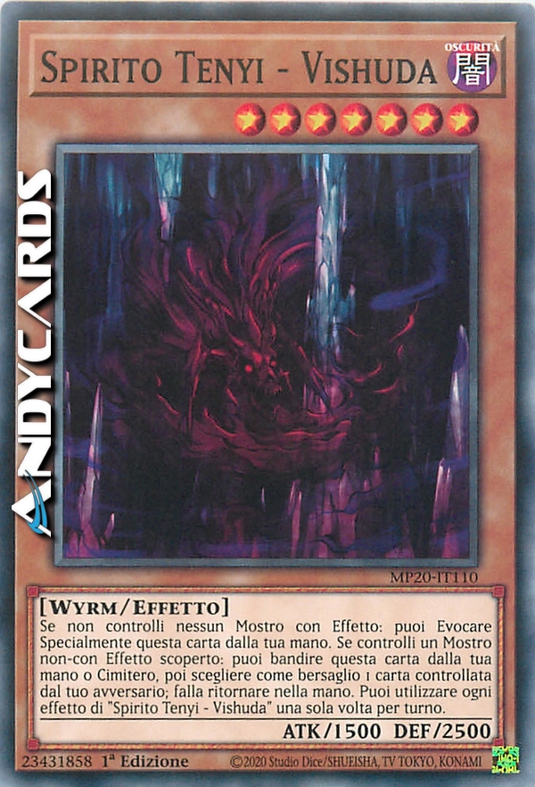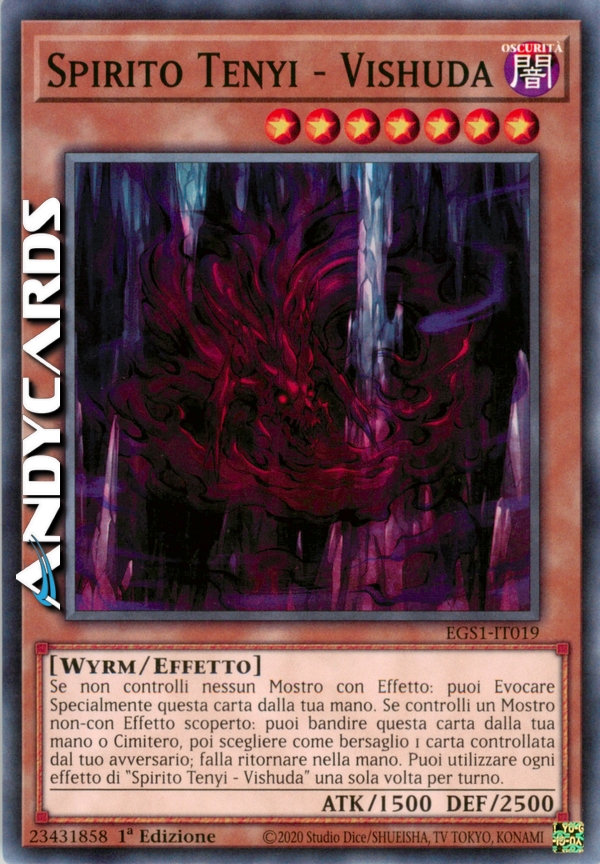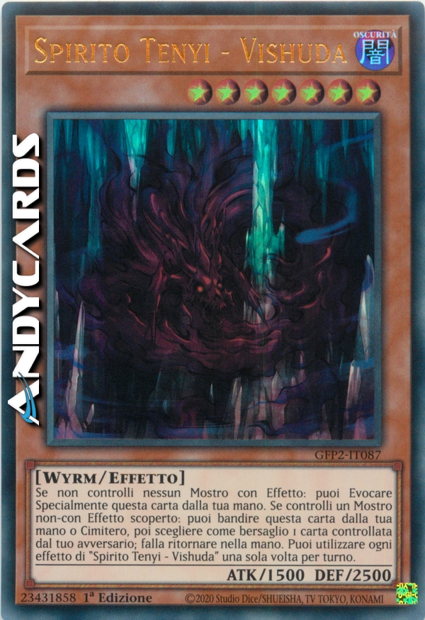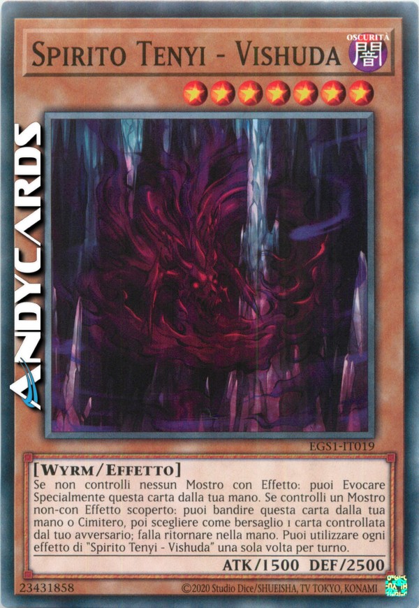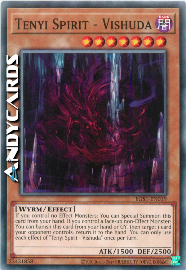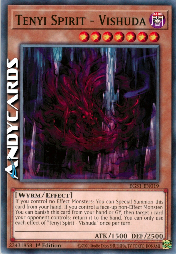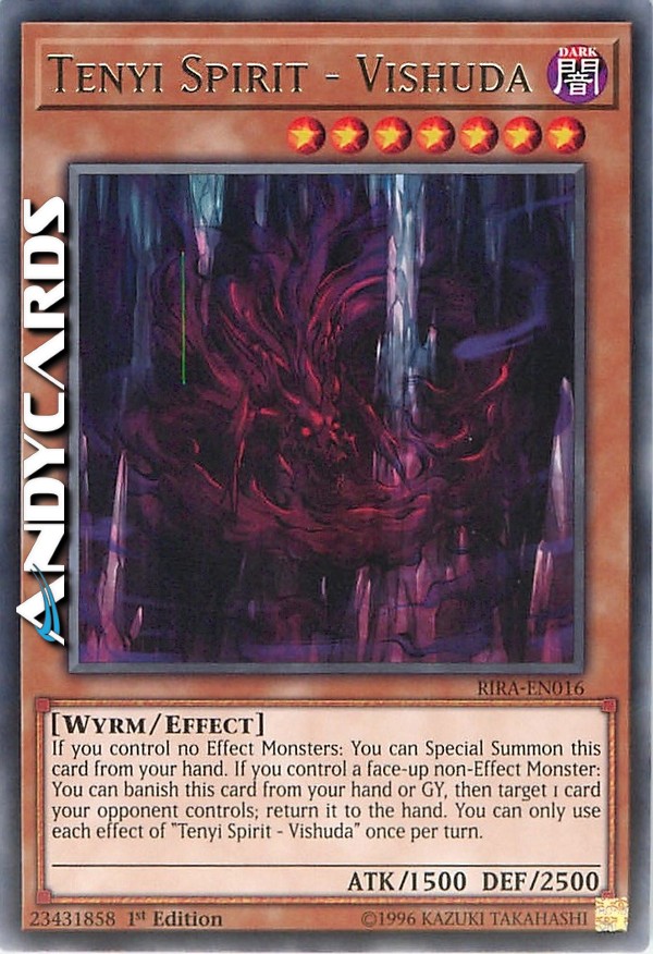 Se non controlli nessun Mostro con Effetto: puoi Evocare Specialmente questa carta dalla tua mano. Se controlli un Mostro non-con Effetto scoperto: puoi bandire questa carta dalla tua mano o Cimitero, poi scegliere come bersaglio 1 carta controllata dal tuo avversario; falla ritornare nella mano. Puoi utilizzare ogni effetto di "Spirito Tenyi - Vishuda" una sola volta per turno.