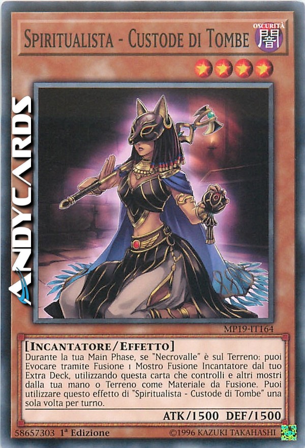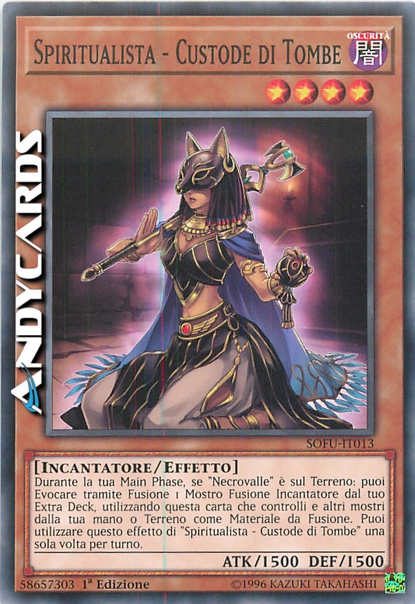 Durante la tua Main Phase, se "Necrovalle" è sul Terreno: puoi Evocare tramite Fusione 1 Mostro Fusione Incantatore dal tuo Extra Deck, utilizzando questa carta che controlli e altri mostri dalla tua mano o Terreno come Materiale da Fusione. Puoi utilizzare questo effetto di "Spiritualista - Custode di Tombe" una sola volta per turno.