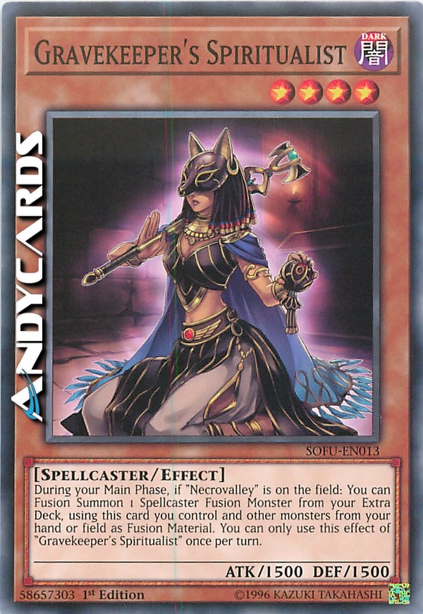 During your Main Phase, if "Necrovalley" is on the field: You can Fusion Summon 1 Spellcaster Fusion Monster from your Extra Deck, using this card you control and other monsters from your hand or field as Fusion Material. You can only use this effect of "Gravekeeper's Spiritualist" once per turn.