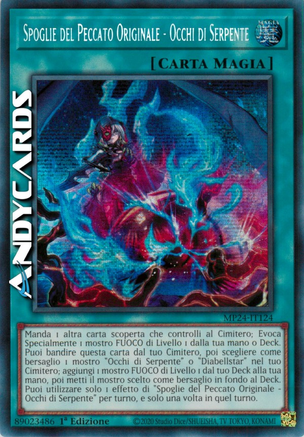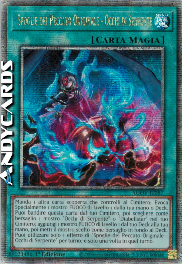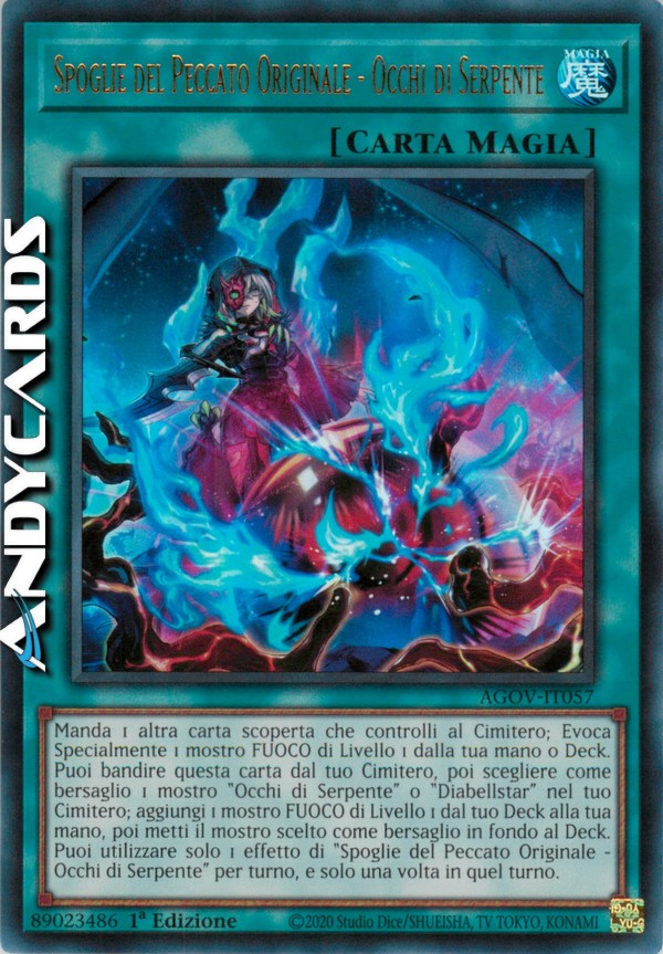 Manda 1 altra carta scoperta che controlli al Cimitero; Evoca Specialmente 1 mostro FUOCO di Livello 1 dalla tua mano o Deck. Puoi bandire questa carta dal tuo Cimitero, poi scegliere come bersaglio 1 mostro "Occhi di Serpente" o "Diabellstar" nel tuo Cimitero; aggiungi 1 mostro FUOCO di Livello 1 dal tuo Deck alla tua mano, poi metti il mostro scelto come bersaglio in fondo al Deck. Puoi utilizzare solo 1 effetto di "Spoglie del Peccato Originale - Occhi di Serpente" per turno, e solo una volta in quel turno.