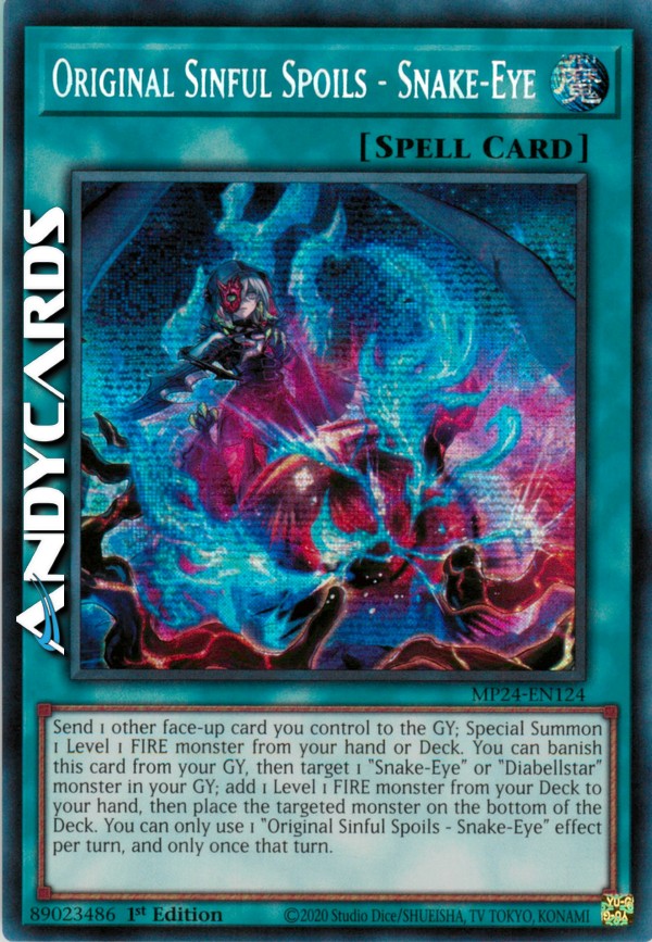 Send 1 other face-up card you control to the GY; Special Summon 1 Level 1 FIRE monster from your hand or Deck. You can banish this card from your GY, then target 1 "Snake-Eye" or "Diabellstar" monster in your GY; add 1 Level 1 FIRE monster from your Deck to your hand, then place the targeted monster on the bottom of the Deck. You can only use 1 "Original Sinful Spoils - Snake-Eye" effect per turn, and only once that turn.