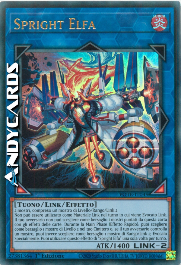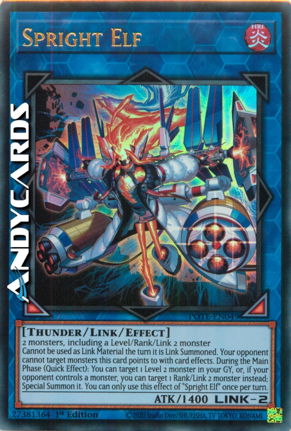 Non può essere utilizzato come Materiale Link nel turno in cui viene Evocato Link. Il tuo avversario non può scegliere come bersaglio i mostri puntati da questa carta con gli effetti delle carte. Durante la Main Phase (Effetto Rapido): puoi scegliere come bersaglio 1 mostro di Livello 2 nel tuo Cimitero o, se il tuo avversario controlla un mostro, puoi invece scegliere come bersaglio 1 mostro di Rango/Link 2; Evocalo Specialmente. Puoi utilizzare questo effetto di "Spright Elfa" una sola volta per turno.
