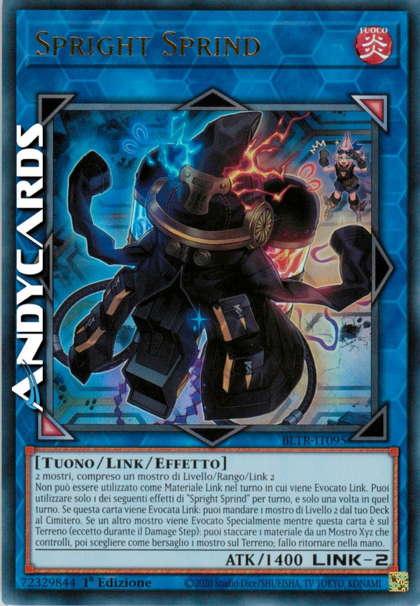 Non può essere utilizzato come Materiale Link nel turno in cui viene Evocato Link. Puoi utilizzare solo 1 dei seguenti effetti di "Spright Sprind" per turno, e solo una volta in quel turno. Se questa carta viene Evocata Link: puoi mandare 1 mostro di Livello 2 dal tuo Deck al Cimitero. Se un altro mostro viene Evocato Specialmente mentre questa carta è sul Terreno (eccetto durante il Damage Step): puoi staccare 1 materiale da un Mostro Xyz che controlli, poi scegliere come bersaglio 1 mostro sul Terreno; fallo ritornare nella mano.