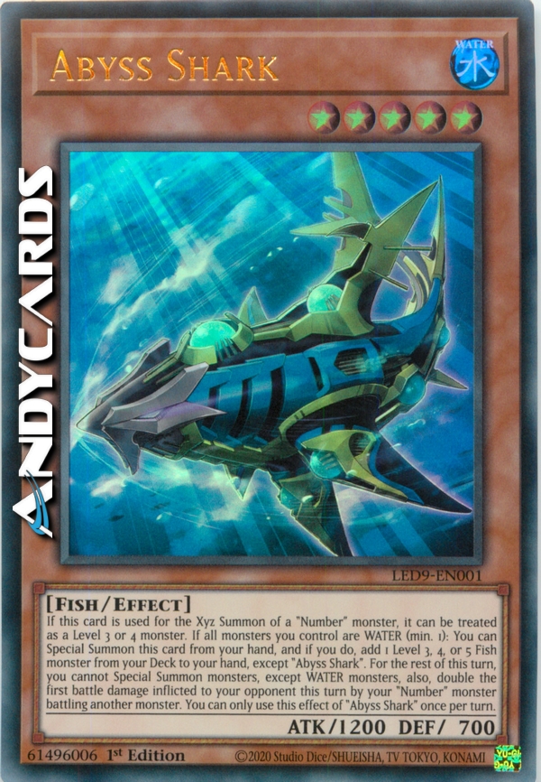 Se questa carta viene utilizzata per l'Evocazione Xyz di un mostro "Numero", essa può essere considerata come un mostro di Livello 3 o 4. Se tutti i mostri che controlli sono ACQUA (minimo 1): puoi Evocare Specialmente questa carta dalla tua mano e, se lo fai, aggiungi 1 mostro Pesce di Livello 3, 4 o 5 dal tuo Deck alla tua mano, eccetto "Squalo Abisso". Per il resto di questo turno, non puoi Evocare Specialmente mostri, eccetto mostri ACQUA, inoltre raddoppia il primo danno da combattimento inflitto al tuo avversario in questo turno da un tuo mostro "Numero" che sta combattendo un altro mostro. Puoi utilizzare questo effetto di "Squalo Abisso" una sola volta per turno.