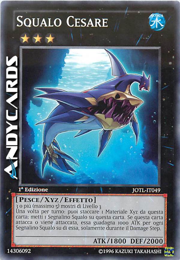 Una volt per turno: puoi staccare 1 Materiale Xyz da questa carta; metti 1 Segnalino Squalo su questa carta. Se questa carta attacca o viene attaccata, essa guadagna 1000 ATK per ogni Segnalino Squalo su di essa, solamente durante il Damage Step.