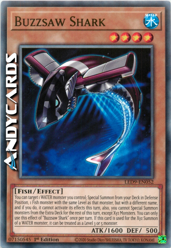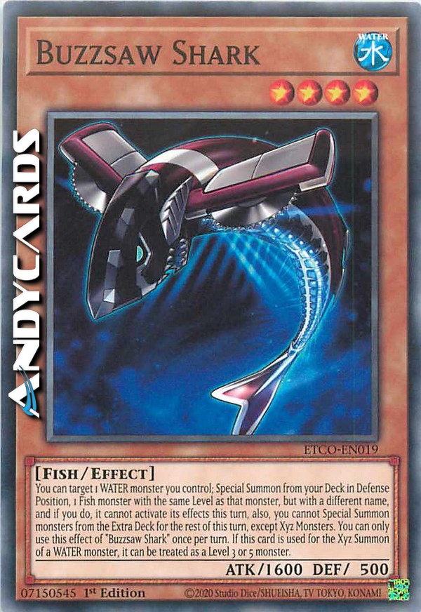You can target 1 WATER monster you control; Special Summon from your Deck in Defense Position, 1 Fish monster with the same Level as that monster, but with a different name, and if you do, it cannot activate its effects this turn, also, you cannot Special Summon monsters from the Extra Deck for the rest of this turn, except Xyz Monsters. You can only use this effect of "Buzzsaw Shark" once per turn. If this card is used for the Xyz Summon of a WATER monster, it can be treated as a Level 3 or 5 monster.