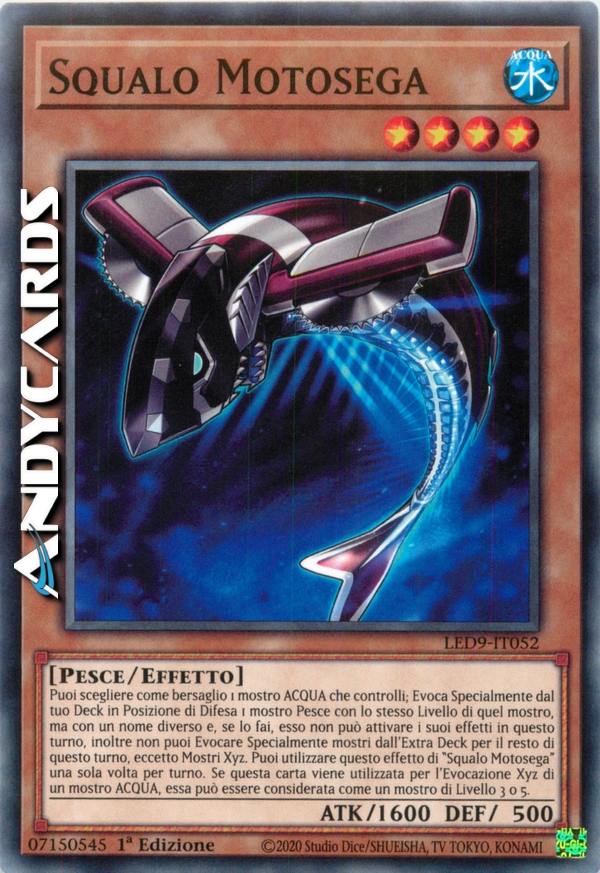 Puoi scegliere come bersaglio 1 mostro ACQUA che controlli; Evoca Specialmente dal tuo Deck in Posizione di Difesa 1 mostro Pesce con lo stesso Livello di quel mostro, ma con un nome diverso e, se lo fai, esso non può attivare i suoi effetti in questo turno, inoltre non puoi Evocare Specialmente mostri dall'Extra Deck per il resto di questo turno, eccetto Mostri Xyz. Puoi utilizzare questo effetto di "Squalo Motosega" una sola volta per turno. Se questa carta viene utilizzata per l'Evocazione Xyz di un mostro ACQUA, essa può essere considerato come un mostro di Livello 3 o 5.