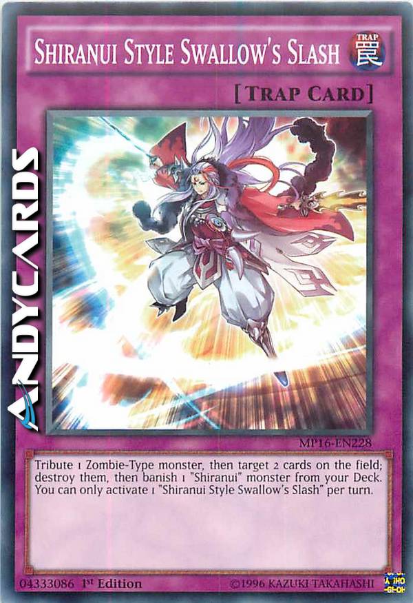 Offri come Tributo 1 mostro di Tipo Zombie, poi scegli come bersaglio 2 carte sul Terreno; distruggile, poi bandisci 1 mostro "Shiranui" dal tuo Deck. Puoi attivare solo 1 "Squarcio della Rondine Stile Shiranui" per turno.