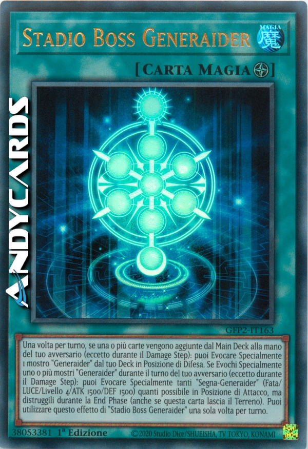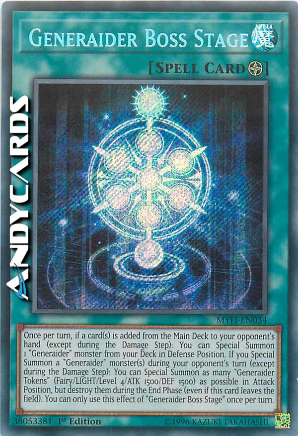 Una volta per turno, se una o più carte vengono aggiunte dal Main Deck alla mano del tuo avversario (eccetto durante il Damage Step): puoi Evocare Specialmente 1 mostro "Generaider" dal tuo Deck in Posizione di Difesa. Se Evochi Specialmente uno o più mostri "Generaider" durante il turno del tuo avversario (eccetto durante il Damage Step): puoi Evocare Specialmente tanti "Segna-Generaider" (Fata/LUCE/Livello 4/ATK 1500/DEF 1500) quanti possibile in Posizione di Attacco, ma distruggili durante la End Phase (anche se questa carta lascia il Terreno). Puoi utilizzare questo effetto di "Stadio Boss Generaider" una sola volta per turno.