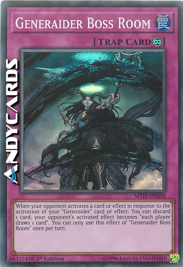 Quando il tuo avversario attiva una carta o effetto in risposta all'attivazione di una tua carta o effetto "Generaider": puoi scartare 1 carta; l'effetto attivato del tuo avversario diventa "ogni giocatore pesca 1 carta". Puoi utilizzare questo effetto di "Stanza Boss Generaider" una sola volta per turno.