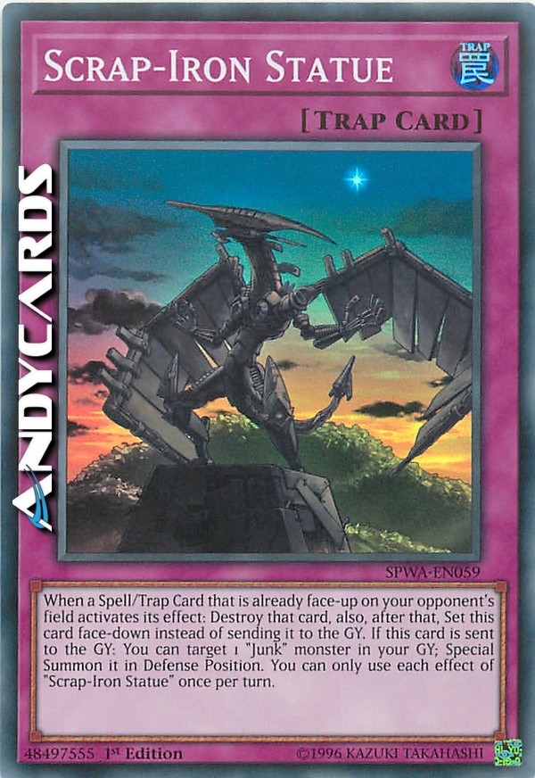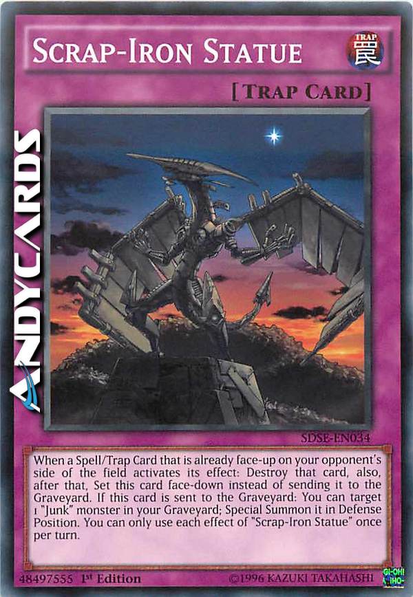 When a Spell/Trap Card that is already face-up on your opponent's side of the field activates its effect: Destroy that card, also, after that, Set this card face-down instead of sending it to the Graveyard. If this card is sent to the Graveyard: You can target 1 "Junk" monster in your Graveyard; Special Summon that target in Defense Position. You can only use each effect of "Scrap-Iron Statue" once per turn.