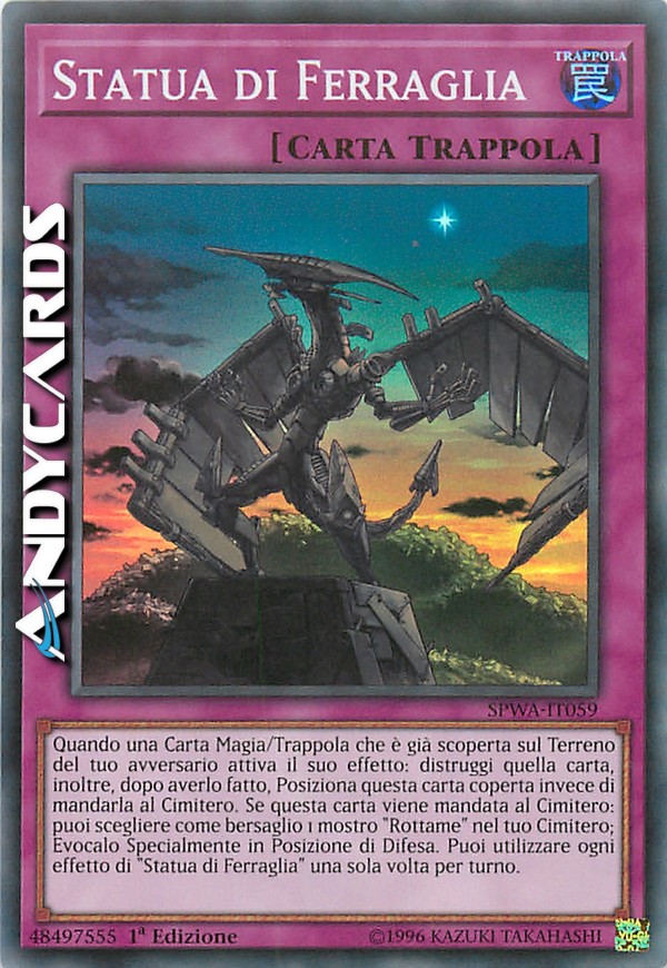 Quando una Carta Magia/Trappola che è già scoperta sul Terreno del tuo avversario attiva il suo effetto: distruggi quella carta, inoltre, dopo averlo fatto, Posiziona questa carta coperta invece di mandarla al Cimitero. Se questa carta viene mandata al Cimitero: puoi scegliere come bersaglio 1 mostro "Rottame" nel tuo Cimitero; Evocalo Specialmente in Posizione di Difesa. Puoi utilizzare ogni effetto di "Statua di Ferraglia" una sola volta per turno.