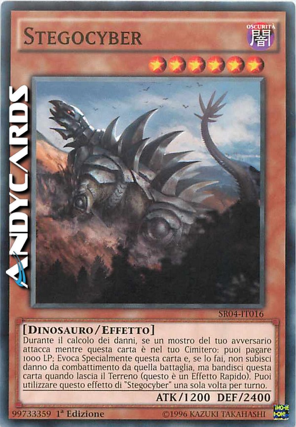 Durante il turno del tuo avversario, al calcolo dei danni, se questa carta è nel tuo Cimitero: puoi pagare 1000 LP; Evocala Specialmente e, se lo fai, non subisci danno da combattimento da quella battaglia, e bandisci questa carta quando lascia il Terreno (questo è un Effetto Rapido). Puoi utilizzare questo effetto di "Stegocyber" una sola volta per turno.