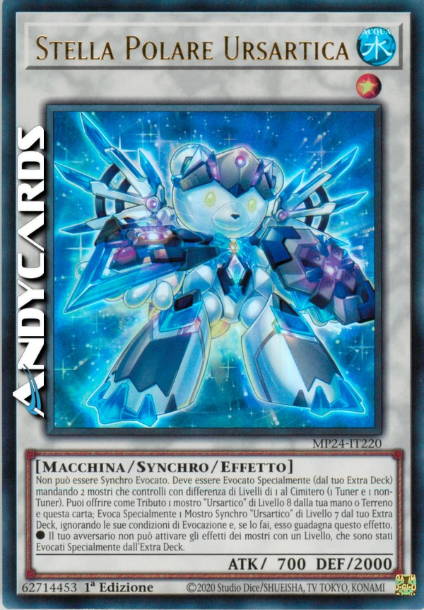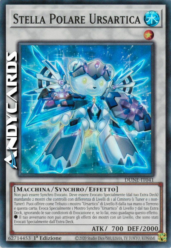 Non può essere Synchro Evocato. Deve essere Evocato Specialmente (dal tuo Extra Deck) mandando 2 mostri che controlli con differenza di Livelli di 1 al Cimitero (1 Tuner e 1 non-Tuner). Puoi offrire come Tributo 1 mostro "Ursartico" di Livello 8 dalla tua mano o Terreno e questa carta; Evoca Specialmente 1 Mostro Synchro "Ursartico" di Livello 7 dal tuo Extra Deck, ignorando le sue condizioni di Evocazione e, se lo fai, esso guadagna questo effetto.