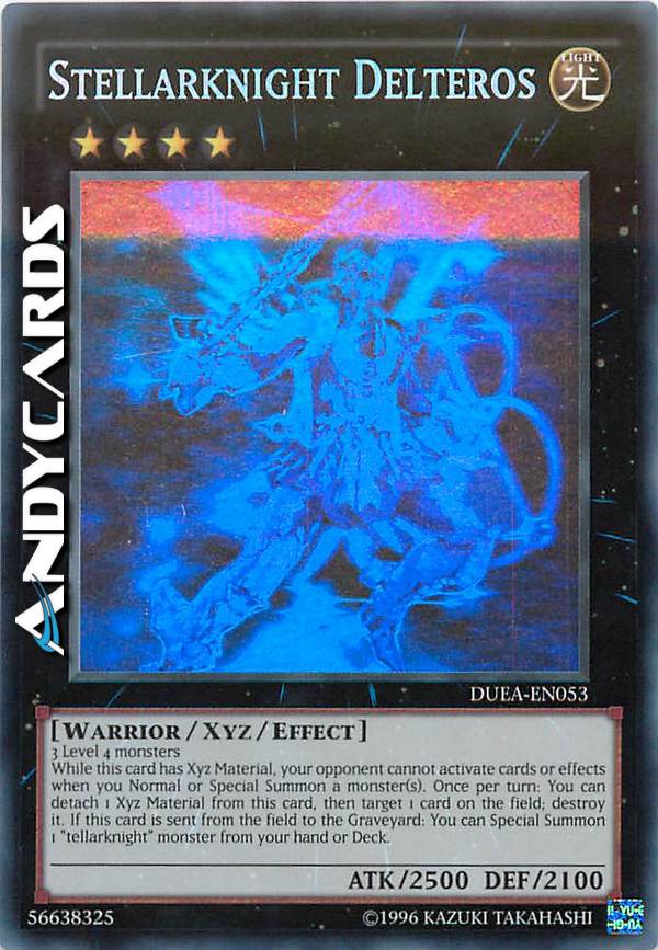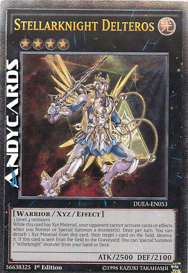 While this card has Xyz Material, your opponent cannot activate cards or effects when you Normal or Special Summon a monster(s). Once per turn: You can detach 1 Xyz Material from this card, then target 1 card on the field; destroy it. If this card is sent from the field to the Graveyard: You can Special Summon 1 "tellarknight" monster from your hand or Deck.