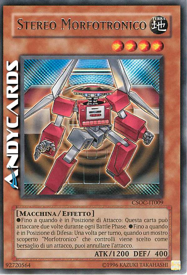 • Fino a quando è in Posizione di Attacco: Questa carta può attaccare due volte durante ogni Battle Phase. • Fino a quando è in Posizione di Difesa: Una volta per turno, quando un mostro scoperto “Morfotronico” che controlli viene scelto come bersaglio di un attacco, puoi annullare l'attacco.