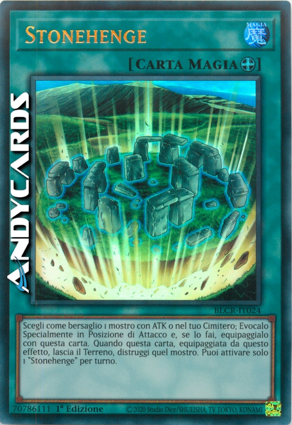Scegli come bersaglio 1 mostro con ATK 0 nel tuo Cimitero; Evocalo Specialmente in Posizione di Attacco e, se lo fai, equipaggialo con questa carta. Quando questa carta, equipaggiata da questo effetto, lascia il Terreno, distruggi quel mostro. Puoi attivare solo 1 "Stonehenge" per turno.