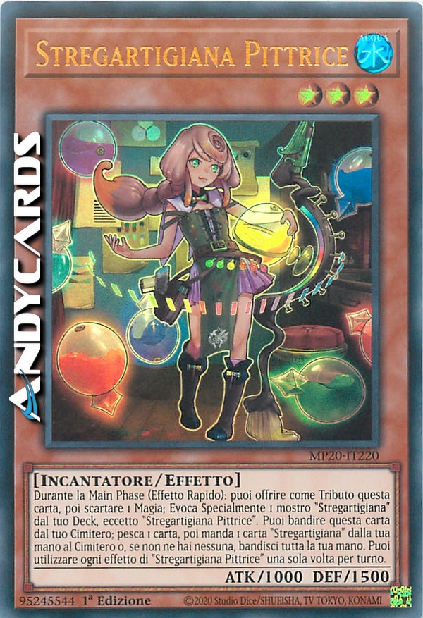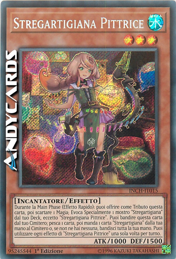Durante la Main Phase (Effetto Rapido): puoi offrire come Tributo questa carta, poi scartare 1 Magia; Evoca Specialmente 1 mostro "Stregartigiana" dal tuo Deck, eccetto "Stregartigiana Pittrice". Puoi bandire questa carta dal tuo Cimitero; pesca 1 carta, poi manda 1 carta "Stregartigiana" dalla tua mano al Cimitero o, se non ne hai nessuna, bandisci tutta la tua mano. Puoi utilizzare ogni effetto di "Stregartigiana Pittrice" una sola volta per turno.