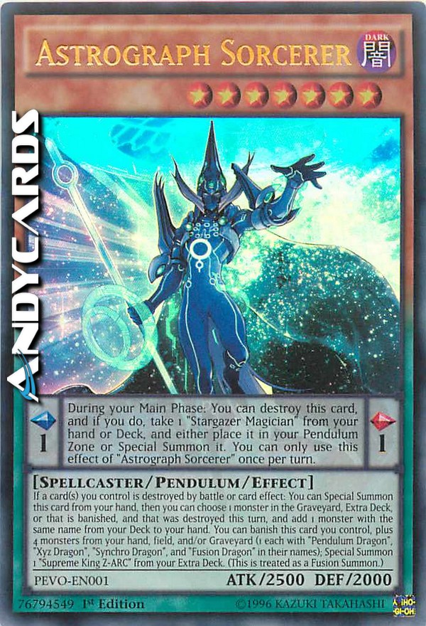 Pendulum Effect: During your Main Phase: You can destroy this card, and if you do, take 1 "Stargazer Magician" from your hand or Deck, and either place it in your Pendulum Zone or Special Summon it. You can only use this effect of "Astrograph Sorcerer" once per turn.
