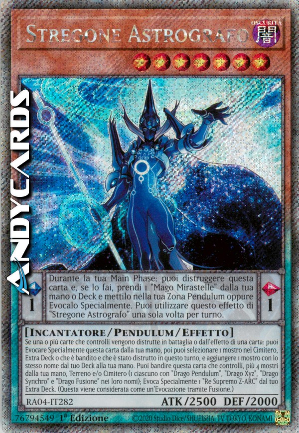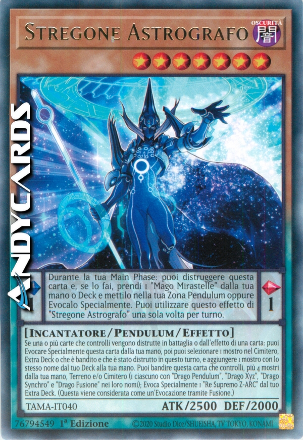 Effetto Pendulum: Durante la tua Main Phase: puoi distruggere questa carta e, se lo fai, prendi 1 "Mago Mirastelle" dalla tua mano o Deck e mettilo nella tua Zona Pendulum oppure Evocalo Specialmente. Puoi utilizzare questo effetto di "Stregone Astrografo" una sola volta per turno.