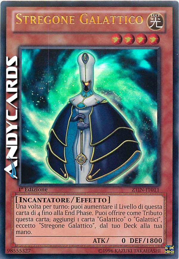 Una volta per turno: puoi aumentare il Livello di questa carta di 4 fino alla fine di questo turno. Puoi offrire come Tributo questa carta; aggiungi 1 carta "Galattico", eccetto "Stregone Galattico", dal tuo Deck alla tua mano.