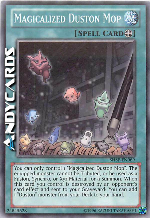 You can only control 1 "Magicalized Duston Mop". The equipped monster cannot be Tributed, or be used as a Fusion, Synchro, or Xyz Material for a Summon. When this card you control is destroyed by your opponent's card effect and sent to the Graveyard: You can add 1 "Duston" monster from your Deck to your hand.