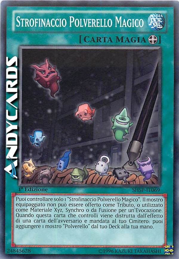 Puoi controllare solo 1 "Strofinaccio Polverello Magico". Il mostro equipaggiato non può essere offerto come Tributo, o utilizzato come Materiale Xyz, Synchro o da Fusione per un'Evocazione. Quando questa carta che controlli viene distutta dall'effetto di una carta dell'avversario e mandata al tuo Cimitero: puoi aggiungere 1 mostro "Polverello" dal tuo Deck alla tua mano.
