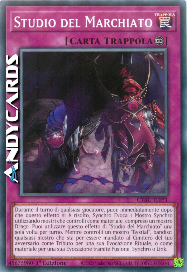 Durante il turno di qualsiasi giocatore, puoi: immediatamente dopo che questo effetto si è risolto, Synchro Evoca 1 Mostro Synchro utilizzando mostri che controlli come materiale, compreso un mostro Drago. Puoi utilizzare questo effetto di "Studio del Marchiato" una sola volta per turno. Mentre controlli un mostro "Bystial", bandisci qualsiasi mostro che sta per essere mandato al Cimitero del tuo avversario come Tributo per una sua Evocazione Rituale, o come materiale per una sua Evocazione tramite Fusione, Synchro o Link.