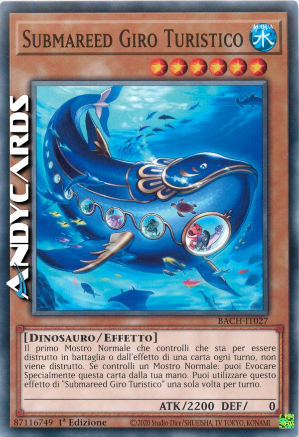 Il primo Mostro Normale che controlli che sta per essere distrutto in battaglia o dall'effetto di una carta ogni turno, non viene distrutto. Se controlli un Mostro Normale: puoi Evocare Specialmente questa carta dalla tua mano. Puoi utilizzare questo effetto di "Submareed Giro Turistico" una sola volta per turno.