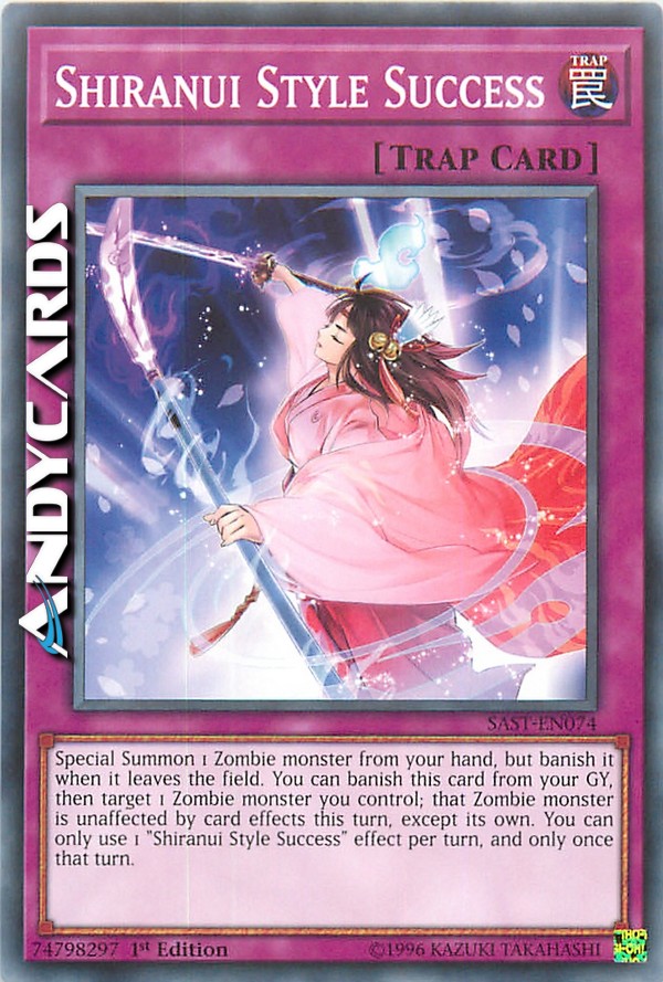 Evoca Specialmente 1 mostro Zombie dalla tua mano, ma bandiscilo quando lascia il Terreno. Puoi bandire questa carta dal tuo Cimitero, poi scegliere come bersaglio 1 mostro Zombie che controlli; quel mostro Zombie è immune agli effetti delle carte in questo turno, eccetto i suoi stessi. Puoi utilizzare solo 1 effetto di "Successo Stile Shiranui" per turno, e solo una volta in quel turno.
