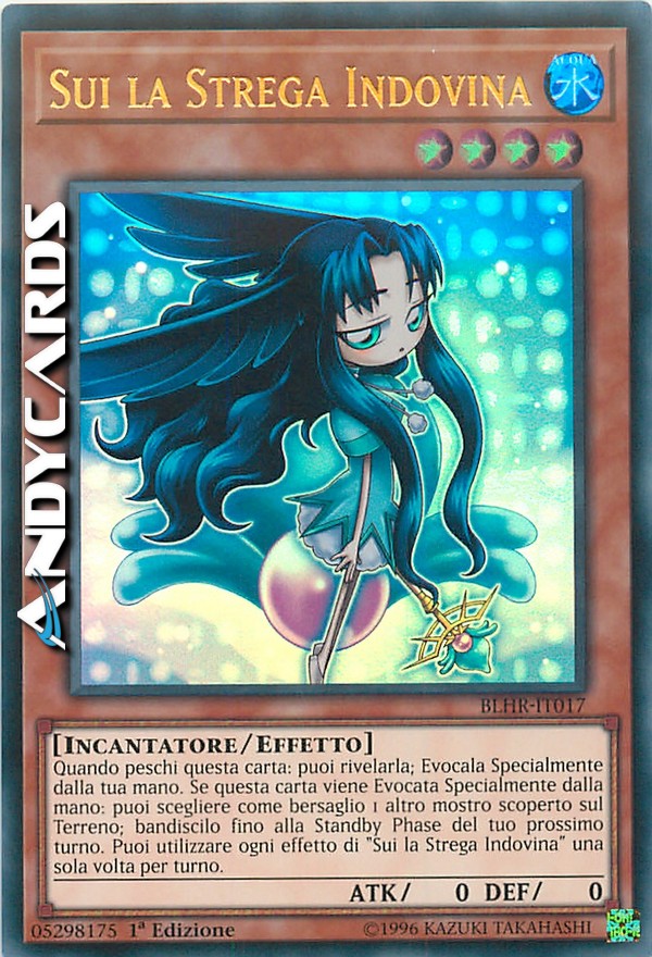 Quando peschi questa carta: puoi rivelarla; Evocala Specialmente dalla tua mano. Se questa carta viene Evocata Specialmente dalla mano: puoi scegliere come bersaglio 1 altro mostro scoperto sul Terreno; bandiscilo fino alla Standby Phase del tuo prossimo turno. Puoi utilizzare ogni effetto di "Sui la Strega Indovina" una sola volta per turno.