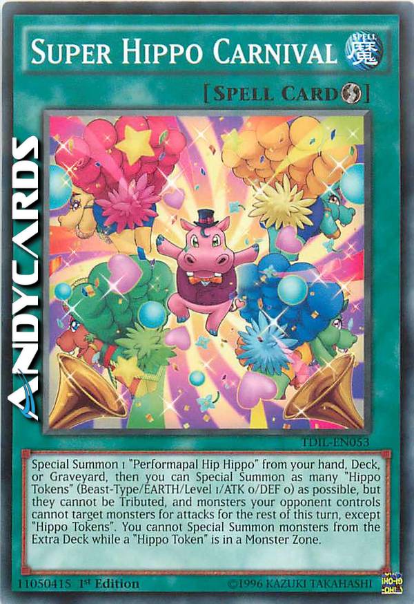 Special Summon 1 "Performapal Hip Hippo" from your hand, Deck, or Graveyard, then you can Special Summon as many "Hippo Tokens" (Beast-Type/EARTH/Level1/ATK 0/DEF 0) as possible, but they cannot be Tributed, and monsters your opponent controls cannot target monsters for attacks for the rest of this turn, except "Hippo Tokens". You cannot Special Summon monsters from the Extra Deck while a "Hippo Token" is in a Monster Zone.