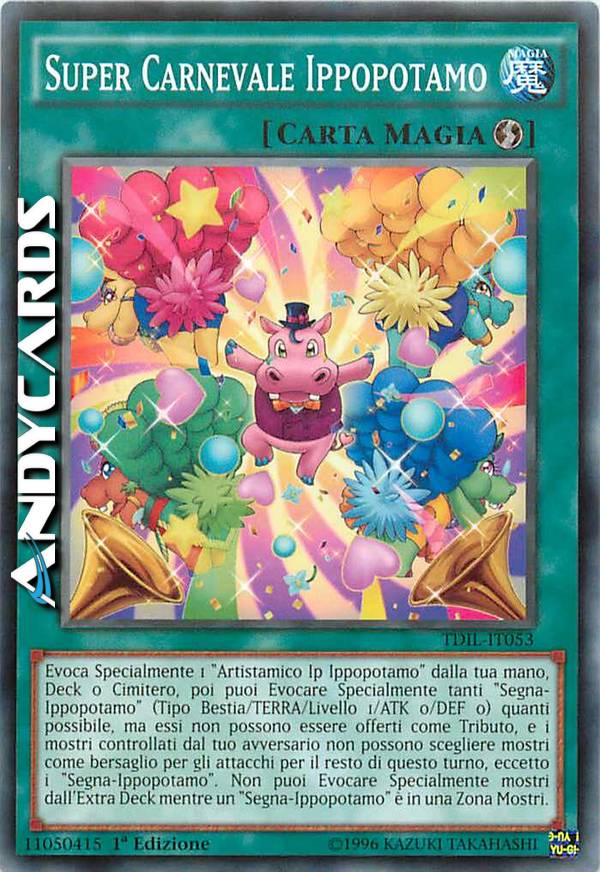 Evoca Specialmente 1 "Artistamico Ip Ippopotamo" dalla tua mano, Deck o Cimitero, poi puoi Evocare Specialmente tanti "Segna-Ippopotamo" (Tipo Bestia/TERRA/Livello 1/ATK 0/DEF 0) quanti possibile, ma essi non possono essere offerti come Tributo, e i mostri controllati dal tuo avversario non possono scegliere mostri come bersaglio per gli attacchi per il resto di questo turno, eccetto i "Segna-Ippopotamo". Non puoi Evocare Specialmente mostri dall'Extra Deck mentre un "Segna-Ippopotamo" è in una Zona Mostri.