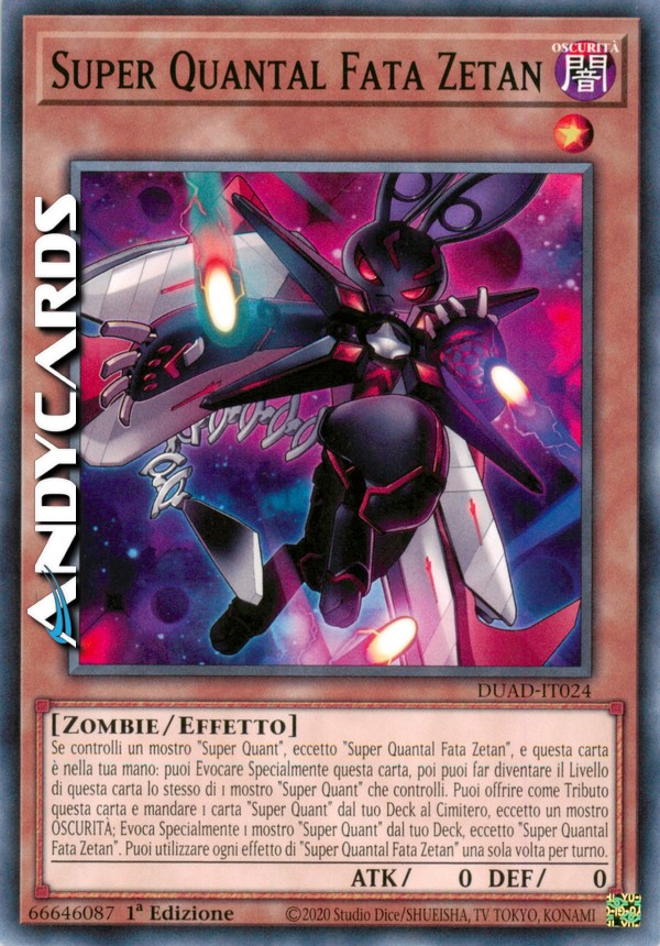 Se controlli un mostro "Super Quant", eccetto "Super Quantal Fata Zetan", e questa carta è nella tua mano: puoi Evocare Specialmente questa carta, poi puoi far diventare il Livello di questa carta lo stesso di 1 mostro "Super Quant" che controlli. Puoi offrire come Tributo questa carta e mandare 1 carta "Super Quant" dal tuo Deck al Cimitero, eccetto un mostro OSCURITÀ; Evoca Specialmente 1 mostro "Super Quant" dal tuo Deck, eccetto "Super Quantal Fata Zetan". Puoi utilizzare ogni effetto di "Super Quantal Fata Zetan" una sola volta per turno.