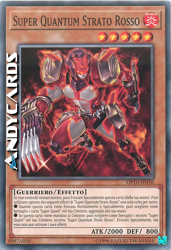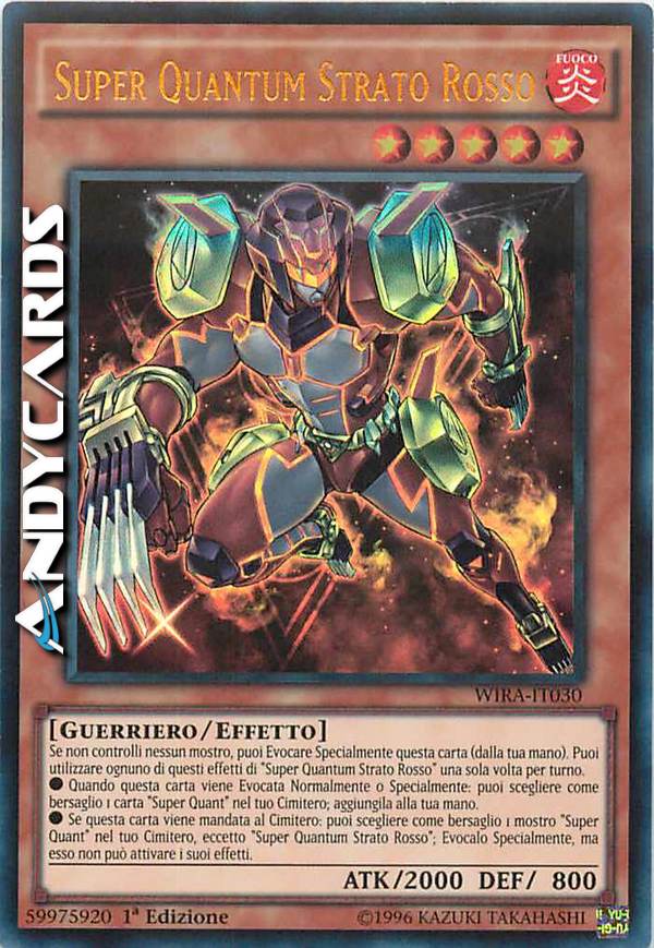 ●Se questa carta viene mandata al Cimitero: puoi scegliere come bersaglio 1 mostro "Super Quant" nel tuo Cimitero, eccetto "Super Quantum Strato Rosso"; Evocalo Specialmente, ma esso non può attivare i suoi effetti.