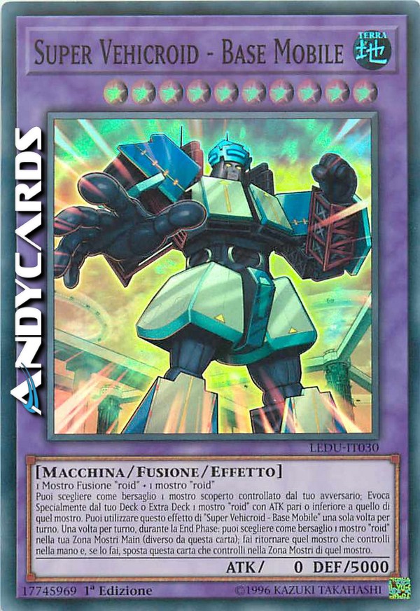 Puoi scegliere come bersaglio 1 mostro scoperto controllato dal tuo avversario; Evoca Specialmente dal tuo Deck o Extra Deck 1 mostro "roid" con ATK pari o inferiore a quello di quel mostro. Puoi utilizzare questo effetto di "Super Vehicroid - Base Mobile" una sola volta per turno. Una volta per turno, durante la End Phase: puoi scegliere come bersaglio 1 mostro "roid" nella tua Zona Mostri Main (diverso da questa carta); fai ritornare quel mostro che controlli nella mano e, se lo fai, sposta questa carta che controlli nella Zona Mostri di quel mostro.