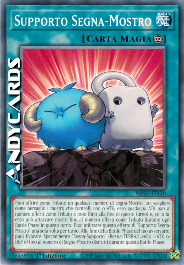 Puoi offrire come Tributo un qualsiasi numero di Segna-Mostro, poi scegliere come bersaglio 1 mostro che controlli con 0 ATK; esso guadagna ATK pari al numero offerti come Tributo x 1000 (fino alla fine di questo turno) e, se lo fa, esso può attaccare mostri fino al numero offerti come Tributo durante ogni Battle Phase in questo turno. Puoi utilizzare questo effetto di "Supporto Segna-Mostro" una sola volta per turno. Alla fine della Battle Phase del tuo avversario: puoi Evocare Specialmente "Segna-Supporto" (Bestia/TERRA/Livello 1/ATK 0/DEF 0) fino al numero di Segna-Mostro distrutti durante questa Battle Phase.