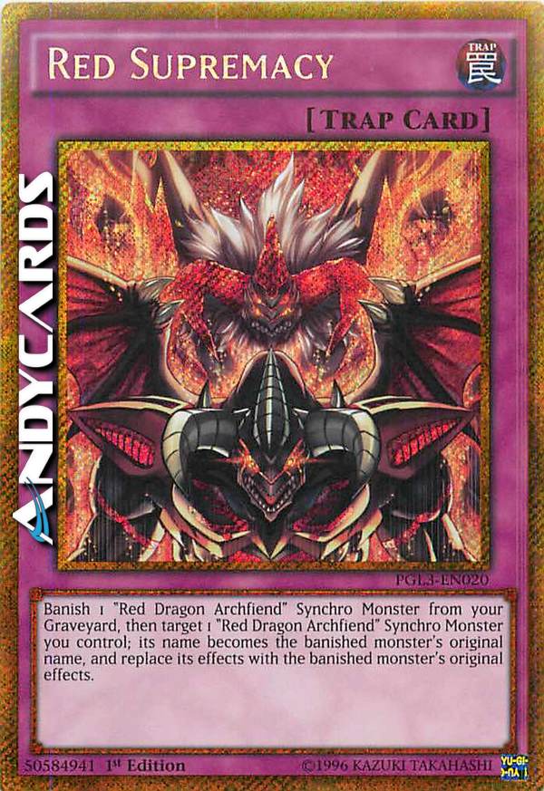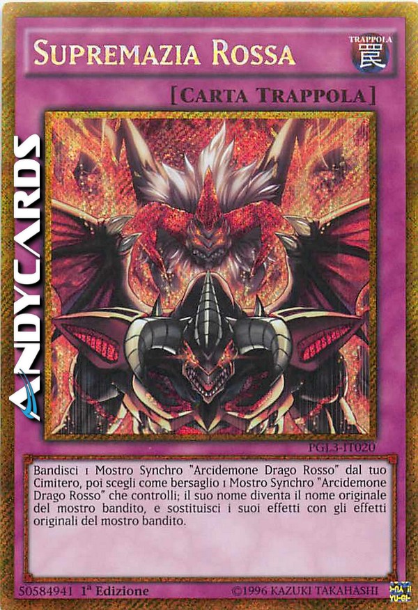 Bandisci 1 Mostro Synchro "Arcidemone Drago Rosso" dal tuo Cimitero, poi scegli come bersaglio 1 Mostro Synchro "Arcidemone Drago Rosso" che controlli; il suo nome diventa il nome originale del mostro bandito, e sostituisci i suoi effetti con gli effetti originali del mostro bandito.