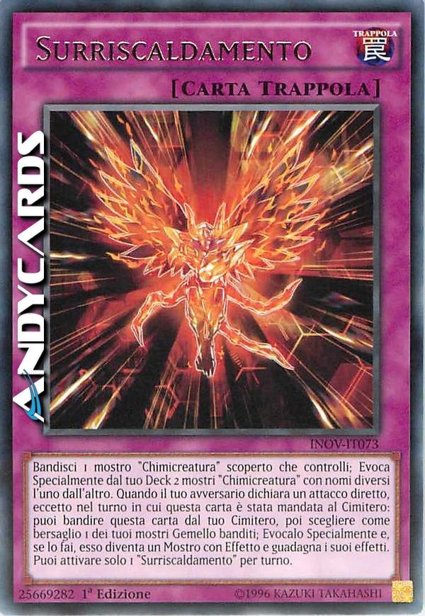 Bandisci 1 mostro "Chimicreatura" scoperto che controlli; Evoca Specialmente dal tuo Deck 2 mostri "Chimicreatura" con nomi diversi l'uno dall'altro. Quando il tuo avversario dichiara un attacco diretto, eccetto nel turno in cui questa carta è stata mandata al Cimitero: puoi bandire questa carta dal tuo Cimitero, poi scegliere come bersaglio 1 dei tuoi mostri Gemello banditi; Evocalo Specialmente e, se lo fai, esso diventa un Mostro con Effetto e guadagna i suoi effetti. Puoi attivare solo 1 "Surriscaldamento" per turno.