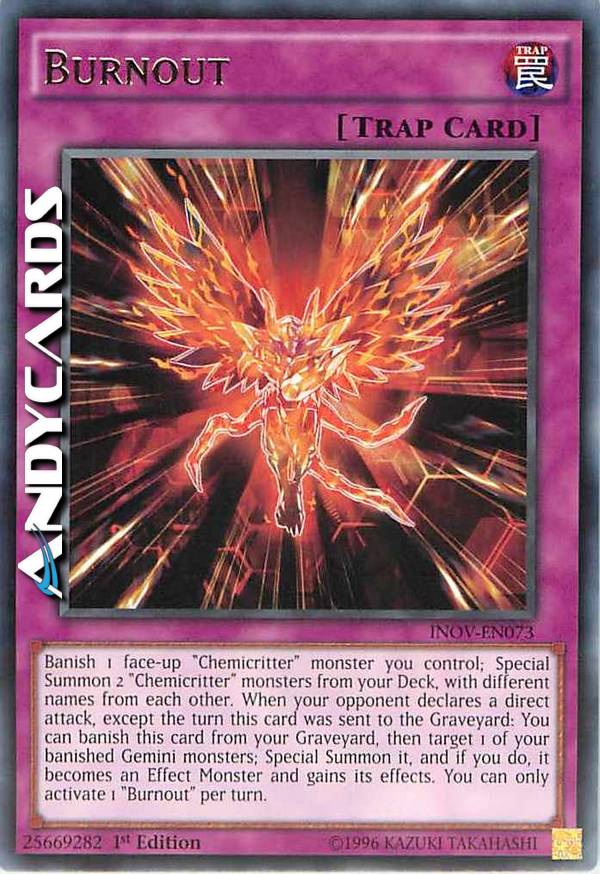 Banish 1 face-up "Chemicritter" monster you control; Special Summon 2 "Chemicritter" monsters from your Deck, with different names from each other. When your opponent declares a direct attack, except the turn this card was sent to the Graveyard: You can banish this card from your Graveyard, then target 1 of your banished Gemini monsters; Special Summon it, and if you do, it becomes an Effect Monster and gains its effects. You can only activate 1 "Burnout" per turn.