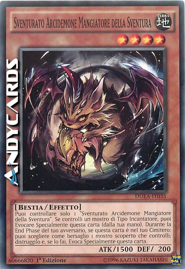 Puoi controllare solo 1 "Sventurato Arcidemone Mangiatore Della Sventura". Se controlli un mostro di tipo Incantatore, puoi Evocare Specialmente questa carta (dalla tua mano). Durante la End Phase del tuo avversario, se questa carta è nel tuo Cimitero: puoi scegliere come bersaglio 1 mostro scoperto che controlli; distruggilo e, se lo fai, Evoca Specialmente questa carta.