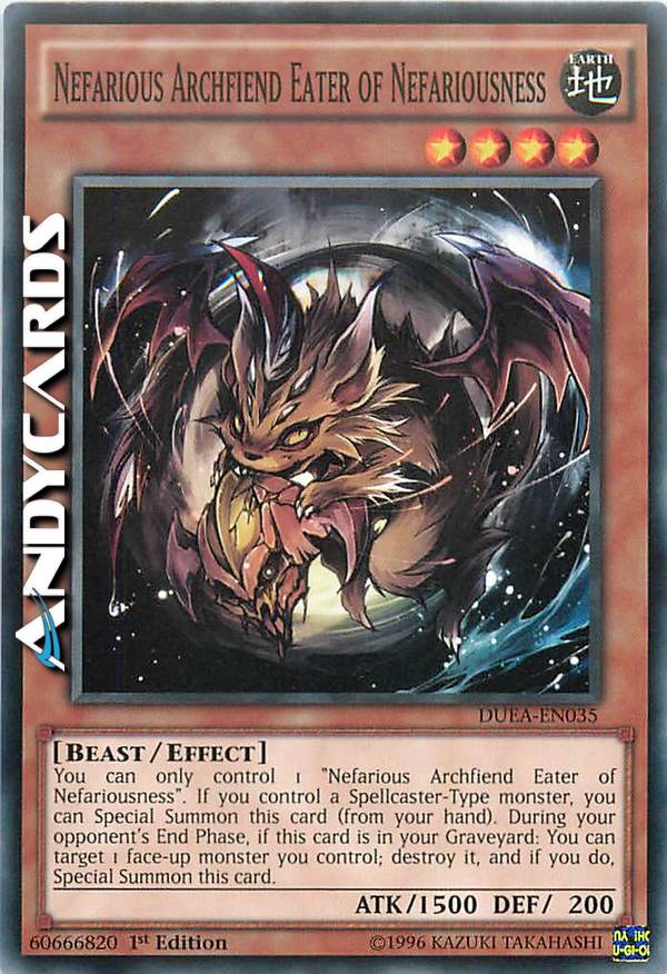 You can only control 1 "Nefarious Archfiend Eater of Nefariousness". If you control a Spellcaster monster, you can Special Summon this card (from your hand). Once per turn, during your opponent's End Phase, if this card is in your GY: You can target 1 face-up monster you control; destroy it, and if you do, Special Summon this card.